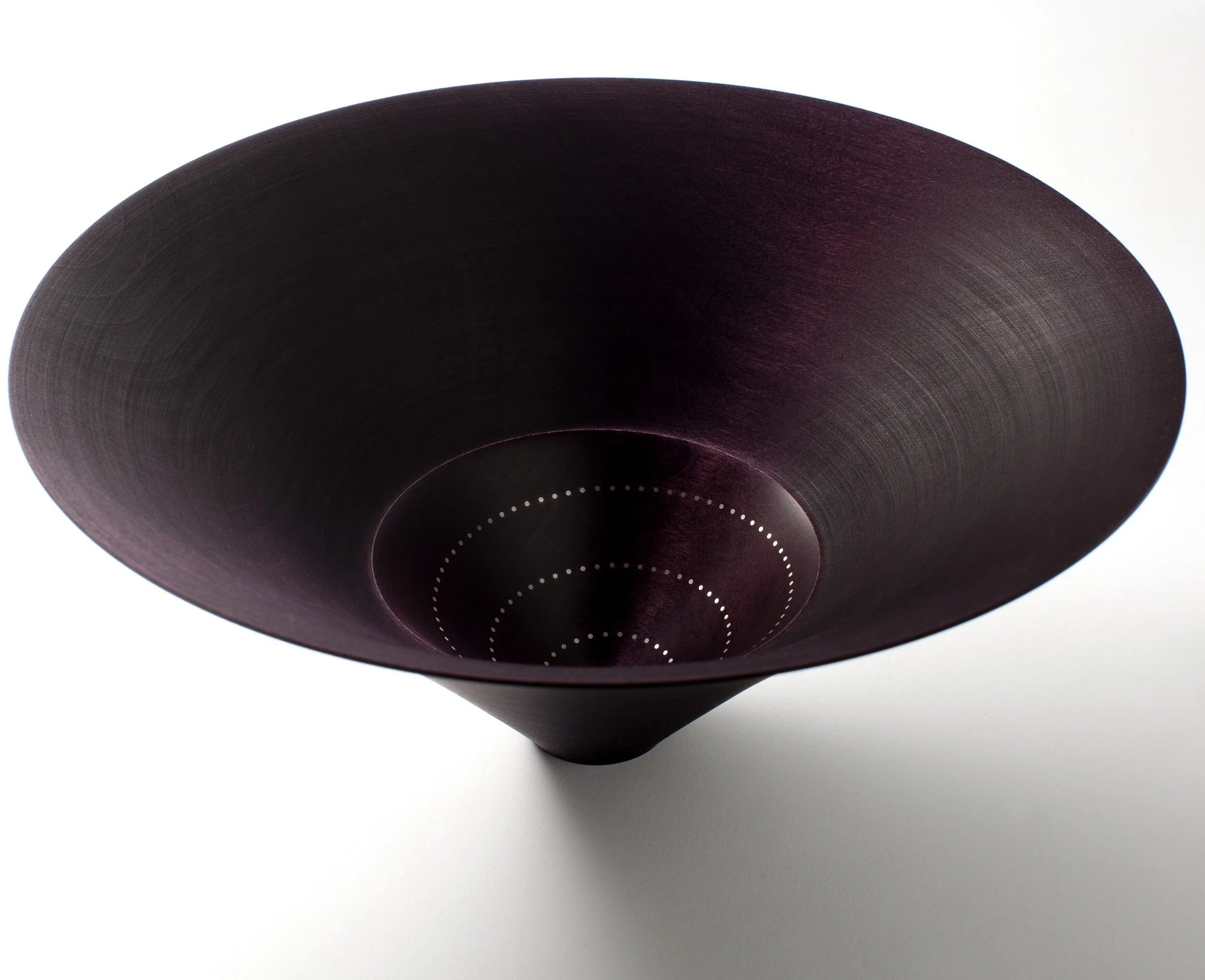 "... Many of his bowls are inlaid with tiny points of silver wire that trace patterns as distinctive and hypnotic as fingerprints, ranging from geometric spirals to hand-drawn wave patterns ..."